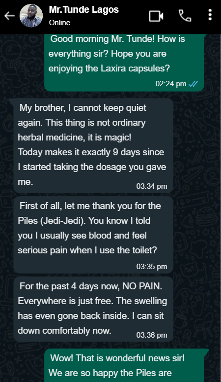 Listen to me, my sister & brother. Don’t let anyone tell you that not going to the toilet for days is ‘normal’ or something you just have to ‘manage.’ That is a lie. This is a dangerous problem, and Laxira is the solution. I feel light again. I feel like Chioma again. Please, don’t suffer as I did. Try this capsule.